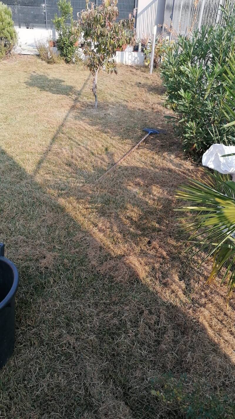 - Carenza Idrica, provocata da impianti che non raggiungono tutte le zone nel prato, irrigazione non sufficiente, come spesso accade vicino ai camminamenti, irrigatore, pop up o centralina non funzionanti, ostruzione del getto d'acqua degli irrigatori o impianto tarato o calibrato male. COSA FARE : E' molto comune accorgersi solo in estate che il nostro impianto non sia tarato bene. In estate l'evapotraspirazione della pianta è altissima ed il consumo irriguo lo è altrettanto. Un impianto di irrigazione serve, quindi se è stato bagnato con il tubo fino adesso è ora che si cominci a pensare seriamente ad un impianto automatico. Il fai da te qui lo sconsiglio, a meno che non ve ne intendiate a sufficienza di pressione, portata e avete gli strumenti giusti, altrimenti, meglio chiamare un professionista che vi farà un lavoro a regola dell'arte. In caso in cui invece avete fatto da soli e per inesperienza o altro avete fatto degli errori di calcolo, bisognerà recuperare immediatamente, aggiungendo pop up dove servono, cambiando le testine o semplicemente testando l'impianto, ricavando i famosi millimetri che servono a gestire correttamente l'acqua di un tappeto erboso. Tutte le zone del prato devono ricevere acqua, alcune zone di più, come le zone prettamente al sole, alcune zone di meno come quelle in ombra. L'evapotraspirazione delle due zone non è la stessa e l'impianto andrebbe tarato dividendo le zone al sole da quelle in ombra. Così facendo si possono diminuire i millimetri d'acqua solo nelle zone in ombra. Se l'esposizione è la stessa, pluviometri alla mano e controlliamo che l'acqua arrivi omogenea da per tutto. A proposito, le zone maggiormente danneggiate dalla carenza idrica di solito sono quelle vicino ai camminamenti poiché la richiesta idrica è maggiore. Bene, possiamo scavare qualche centimetro dal cordolo ed inserire un isolante termico, di solito un paio di centimetri bastano. Vi sono in commercio isolanti che vengono usati per i vasi in metallo, appunto per evitare il surriscaldamento. Possiamo agire anche con concimazioni organiche per strutturare il suolo, preferibilmente su tutto il prato, questo comporterà a lungo andare la creazione di colloidi organici, che tratterranno maggiormente acqua e nutrienti. L'anno scorso con lo stesso problema ho usato della zeolite, inserendo circa 4kg al m2 . La zeolite è un ottimo minerale, che trattiene acqua e nutrienti e rilascia al bisogno. Aumenterà anche lo scambio cationico al suolo. Attenzione però che in un suolo troppo argilloso ne va valutata l'applicazione. Parlo comunque di un suolo di medio impasto senza particolari problematiche. L'inserimento di una sub irrigazione creando una zona dedicata potrebbe risolvere il problema, ma attenzione alle lavorazioni nel terreno come bucature, oppure un pop up esterno dedicato. Nella pratica estiva, consolidata la presenza di questa problematica l'unico modo di tamponare il problema è un irrigazione manuale aggiuntiva senza sovradosare l'acqua al resto del prato. Sarebbe bene, nella progettazione di un tappeto erboso, tenere conto di tutte le problematiche esistenti, cosa che purtroppo fanno in pochi. Un altro problema da stress idrico molto comunque è situato nelle vicinanze di arbusti, siepi o alberi, che ovviamente avendo radici più importanti, effettuano la classica competizione, rubando letteralmente acqua e nutrienti al prato. Provvediamo a realizzare una linea di irrigazione dedicata alle siepi e mettiamo un classico collare ai piedi della pianta con pacciamatura. Non voglio andare OT ma anche le piante vanno bagnate e concimate. Un diradamento da stress idrico, prevede di solito una trasemina, verifichiamo comunque che l'erba sia effettivamente morta prima di procedere e non solo in stato di quiescenza. Le specie rizomatose, resistono parecchio tempo senza acqua, prima di morire.