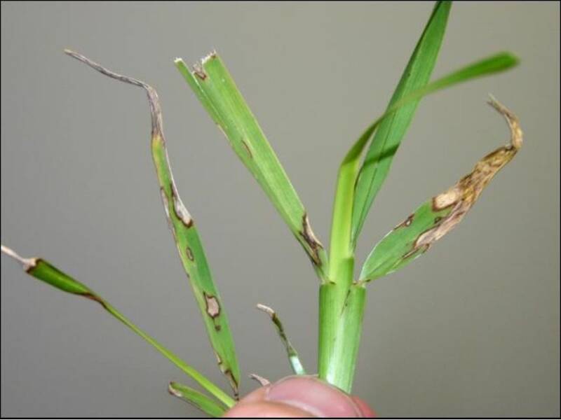 La chiazza grande (Figura 8) e la macchia grigia sulle foglie (Figura 9) sono due principali problemi di malattia dell'erba di Sant'Agostino. Grandi macchie si verificano in climi caldi e umidi e sono incoraggiate da un eccesso di azoto. Generalmente è più evidente durante i mesi primaverili e autunnali. La macchia grigia delle foglie si verifica durante la stagione delle piogge estive ed è principalmente un problema sulla nuova crescita. Entrambe le malattie possono essere controllate con fungicidi.