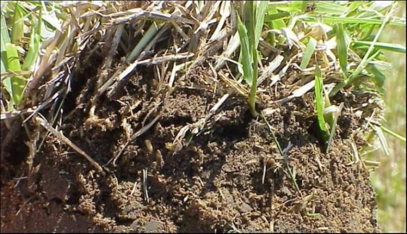 Figura 11. Strati di paglia possono svilupparsi nell'erba di St. Augustine, soprattutto quando i tassi di fertilizzazione o irrigazione sono elevati.